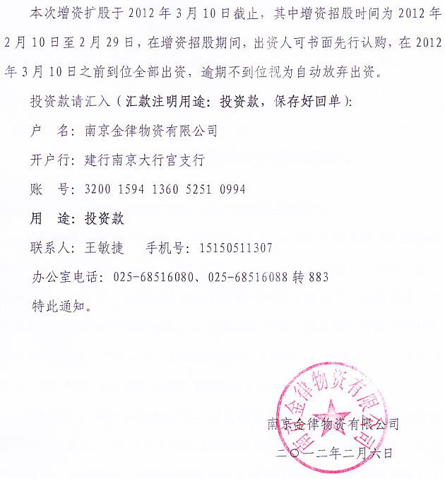 關于對金律公司增資擴股的通知