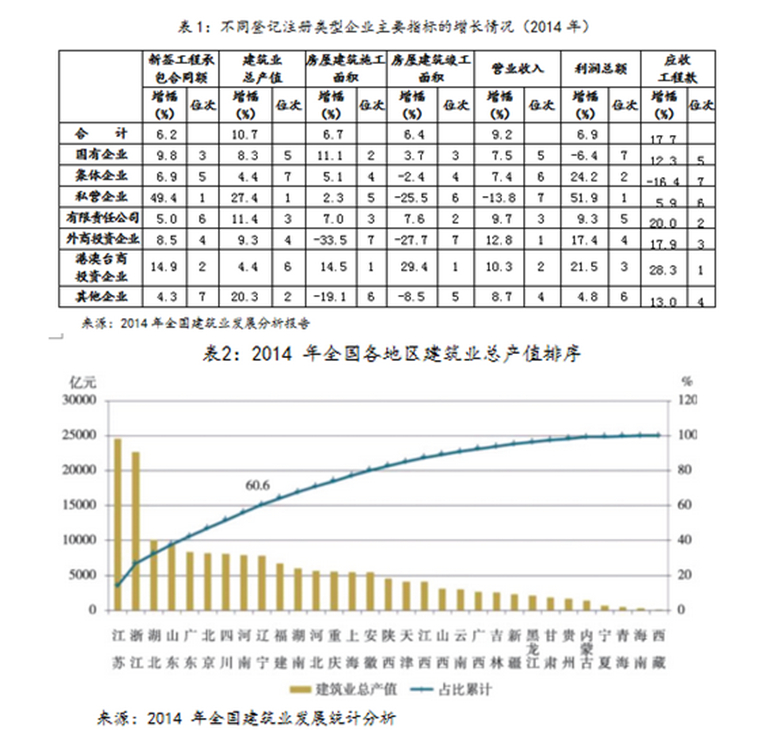 目前,全國(guó)大部分建筑業(yè)企業(yè)為民營(yíng),江蘇、浙江、廣東等東部省份95% 以上是民營(yíng)企業(yè)。民營(yíng)建企的產(chǎn)值規(guī)模從開(kāi)始的幾百萬(wàn)元增長(zhǎng)到數(shù)十億元,不少企業(yè)超過(guò)100億元,甚至超400 億元。建筑業(yè)發(fā)達(dá)省份民營(yíng)建企的施工產(chǎn)值50% 以上是在省外市場(chǎng)完成的,許多省份外來(lái)注冊(cè)施工企業(yè)超過(guò)千家,中西部地區(qū)有的省份外來(lái)施工企業(yè)數(shù)量超過(guò)本省施工企業(yè)數(shù)量。大部分實(shí)力較強(qiáng)的企業(yè)還把市場(chǎng)延伸到了世界各地。目前,江蘇民營(yíng)建企已經(jīng)覆蓋到了全球120 多個(gè)國(guó)家和地區(qū),營(yíng)業(yè)額以年均20% 左右的速度增長(zhǎng),呈現(xiàn)出多元化、多專(zhuān)業(yè)的良好發(fā)展態(tài)勢(shì)。 2014 年,江蘇省2.7 萬(wàn)億建筑業(yè)總產(chǎn)值的90% 以上為民營(yíng)企業(yè)所完成。