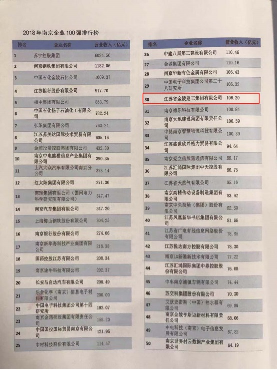 2019年12月20日,南京市企業(yè)聯(lián)合會、南京市企業(yè)家協(xié)會公布“2018年南京市企業(yè)100強”榜單,集團公司入選榜單,位居第30名。